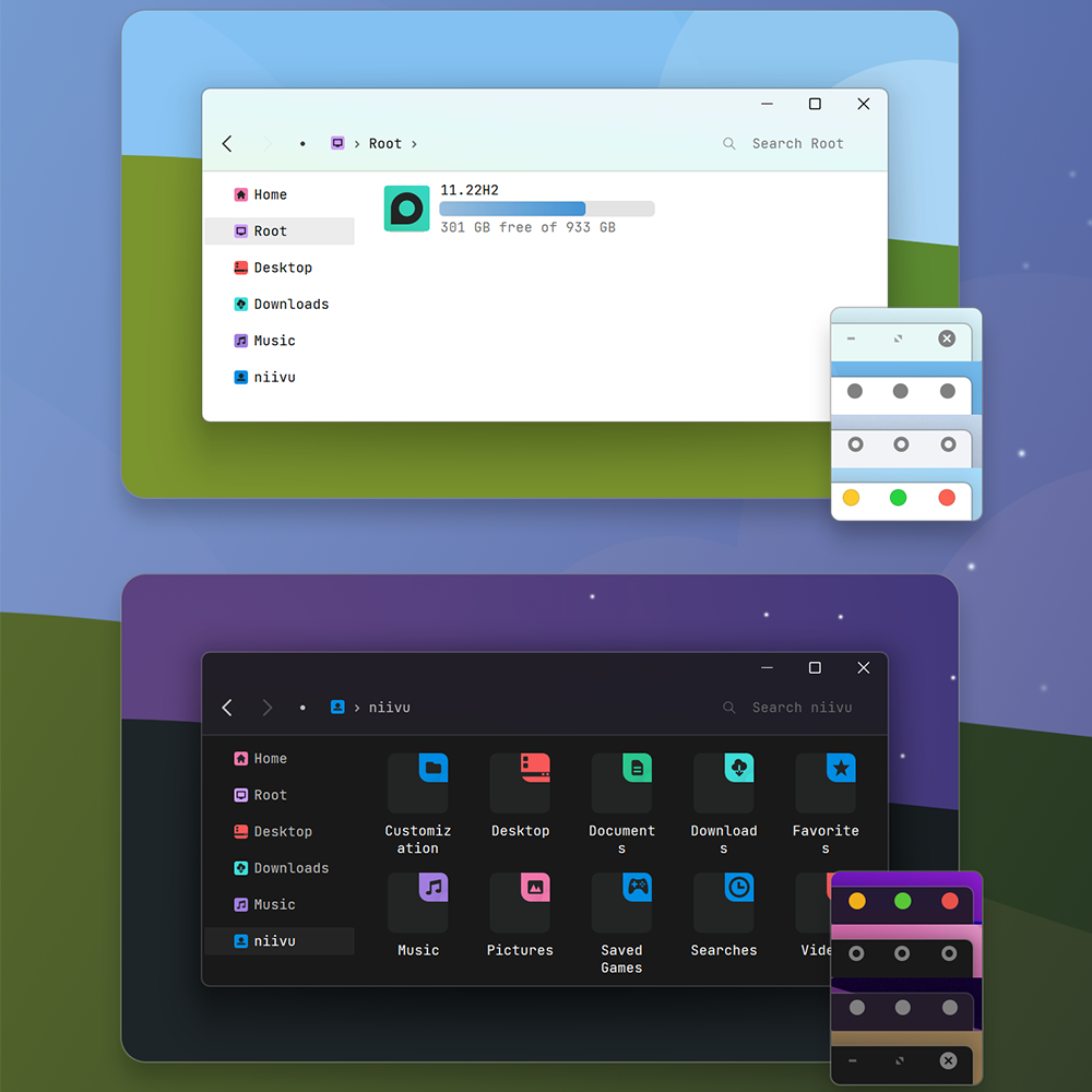 分享 8 款 Win11 系统的第三方美化主题给喜欢折腾桌面美化的小伙伴,主题仅支持 Win11 22H2 版本,理论上 23H2 也是可以使用的。部分主题包括了图标、壁纸、一些软件的皮肤、鼠标指针等。