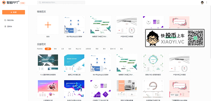 「WPS智能PPT」目前只有在线版,只要登录账号就可以完全免费使用。内置的PPT模板不算多,目前包含有商业计划书、年终总结、工作汇报、毕业答辩类的模板,基本涵盖职场常用类型,用来应付汇报总结啥的应该也是足够了。