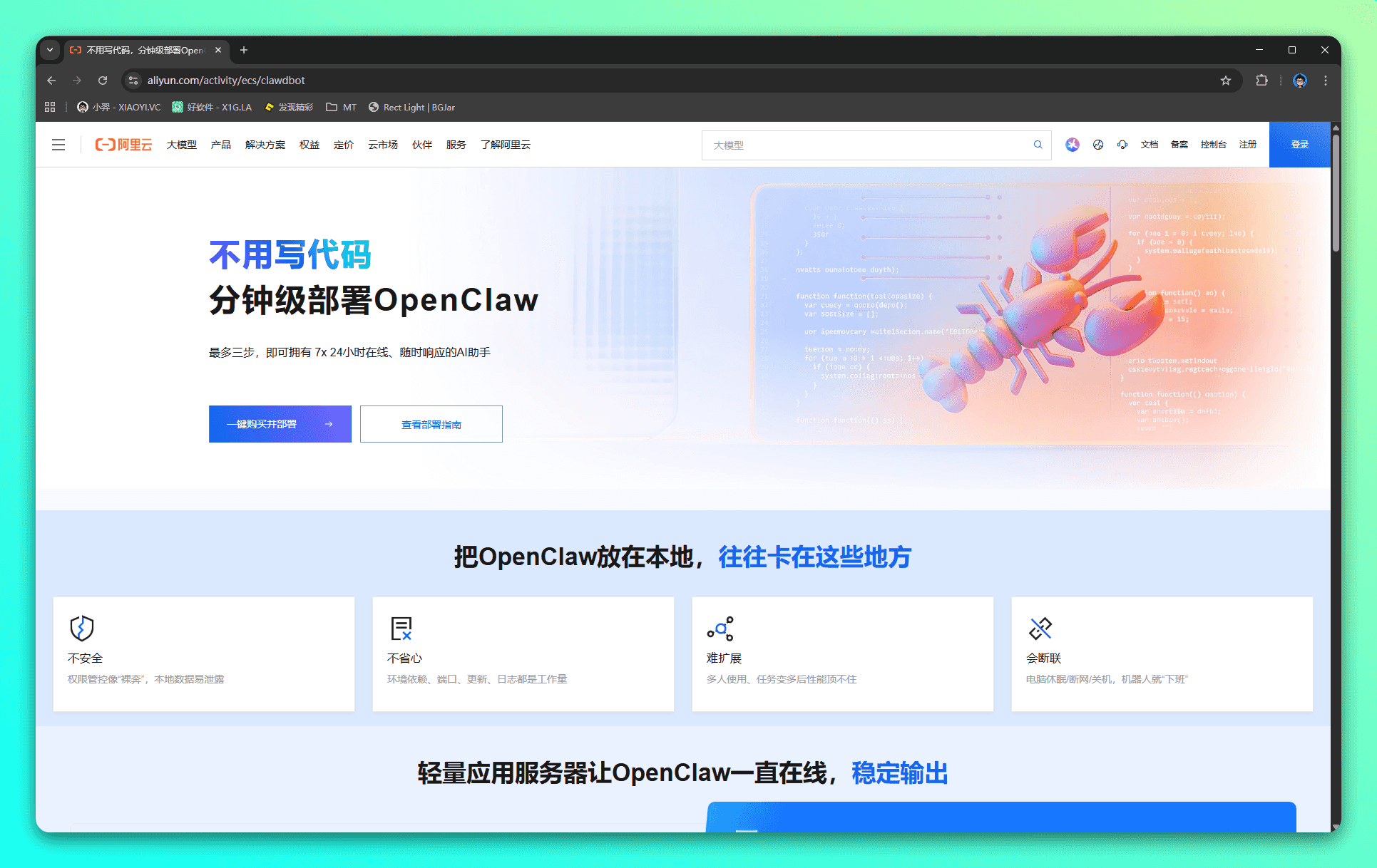 不过 OpenClaw 部署起来很麻烦,现在新手小白用户可以通过云服务器商的快速部署,实现一键、分钟级部署 OpenClaw ,例如:百度智能云 - 小龙虾 (OpenClaw) 一键部署、MaxClaw – Minimax 版小龙虾 (OpenClaw) 一键部署、Kimi Claw – Kimi 云端 OpenClaw,现在阿里云官方也推出了最多三步,即可拥有 7x 24 小时在线、随时响应的 AI 助手。