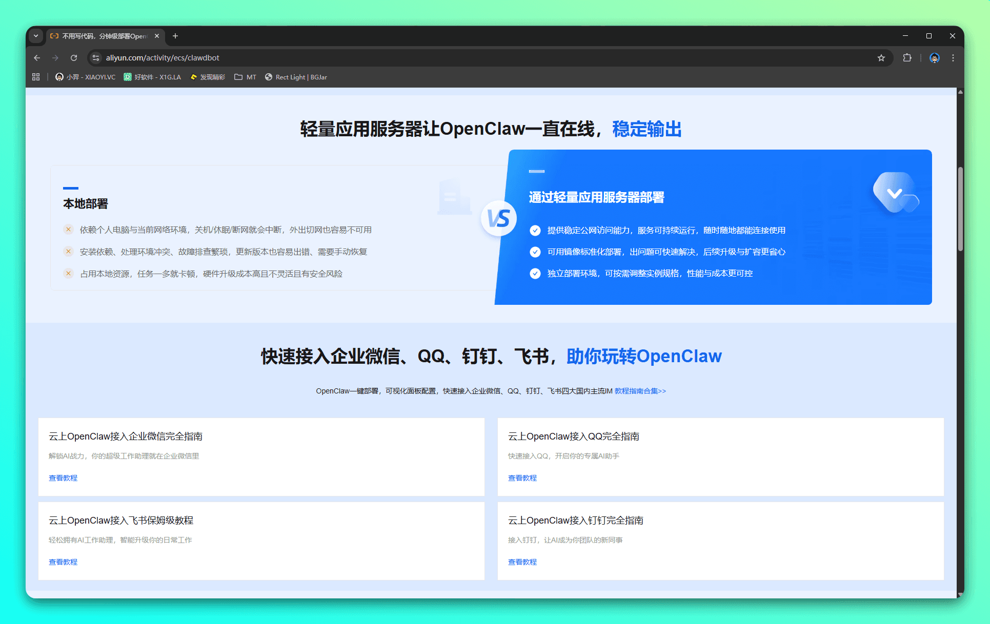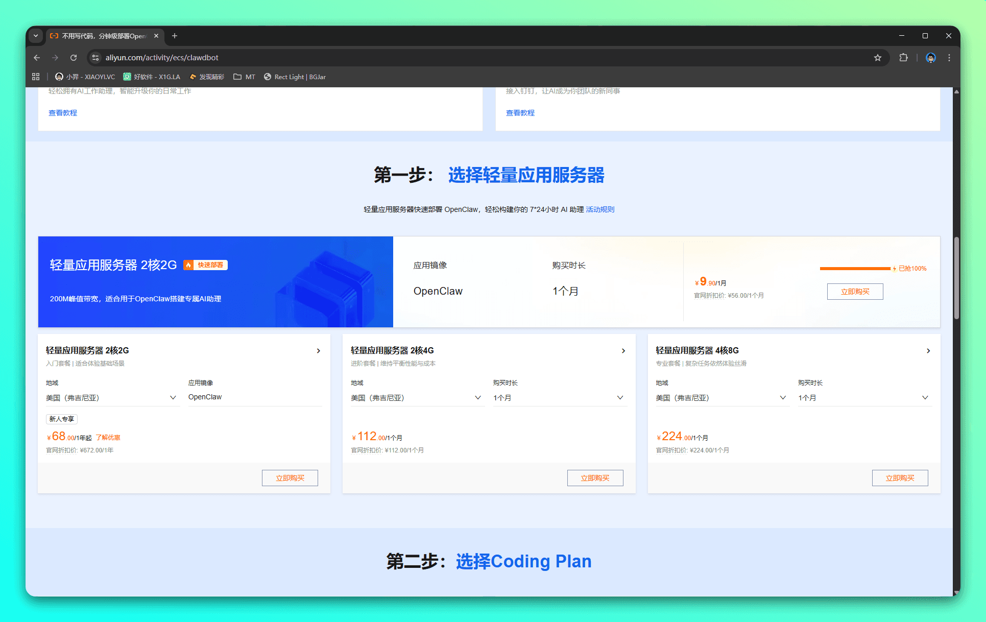 - OpenClaw 尝鲜体验套餐:轻量应用服务器搭配 Coding Plan ,算力一步到位;每月 1.8 万次请求,远离 tokens 焦虑。提供可视化配置、支持 qwen3.5-plus、kimi-k2.5、glm-5、MiniMax-M2.5 等模型