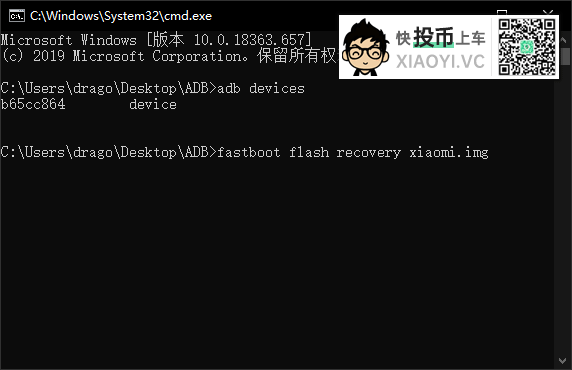 例如:fastboot flash recovery xiaomi.img ,然后回车。
