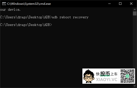 9.CMD命令行输入:adb reboot recovery,回车。手机会重启到「TWRP」模式。
