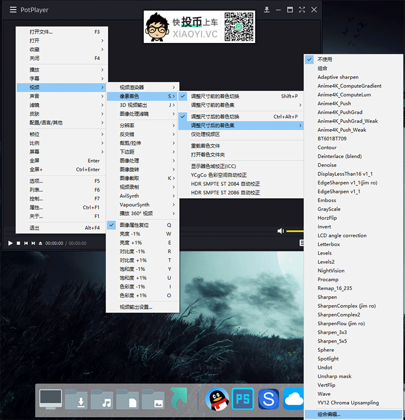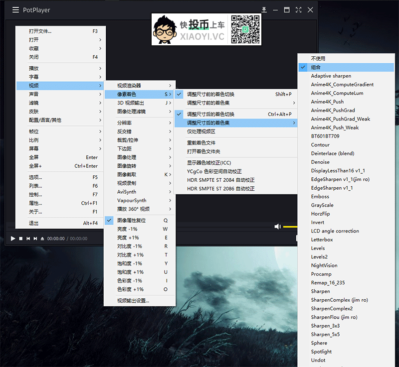 5.「PotPlayer」播放器 → 界面右键 → 视频 → 像素着色 → 调整尺寸后的着色集 → 选择组合。