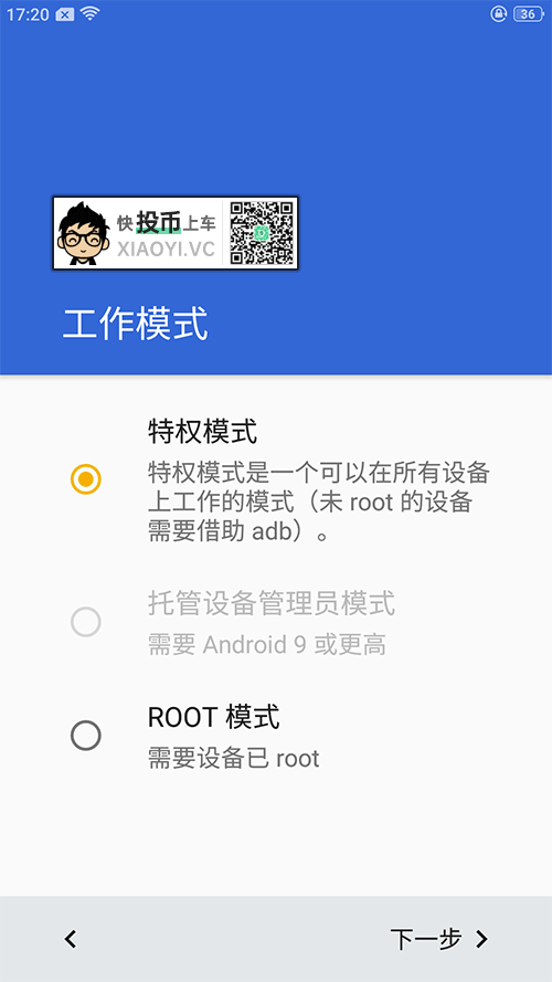 1.把「APP Ops」「shizuku」两个APP都先安装到手机上。然后运行「APP Ops」选择特权模式,然后一路下一步。