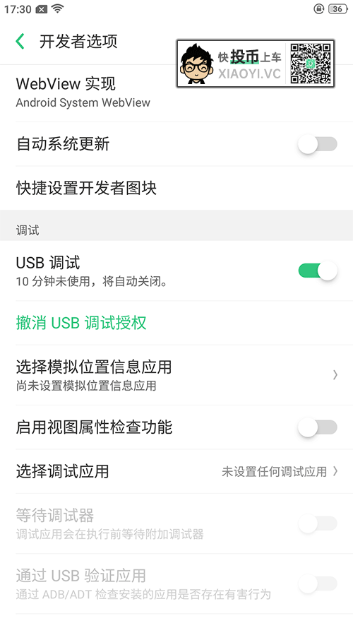 2.手机打开USB调试。开启方法一般都是手机设置 - 关于 - 按版本号7次,开启开发者模式,进入开发者模式里面开启USB调试。有些手机还需要开启禁止权限监控。