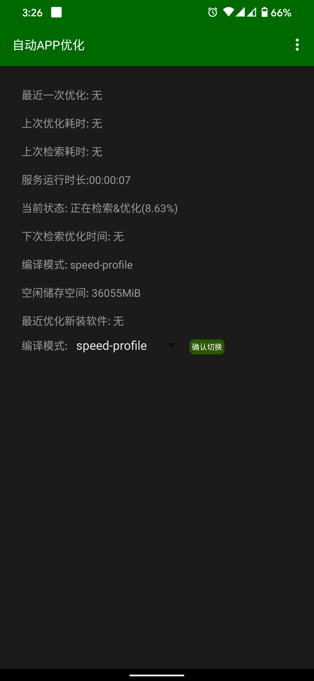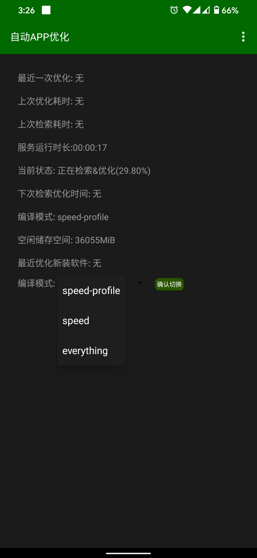 「自动APP优化」支持多种编译模式,推荐用 everything 性能最快,但是会占用比较多是存储空间。另外建议把「自动APP优化」设置白名单,避免优化过程中被系统杀后台。