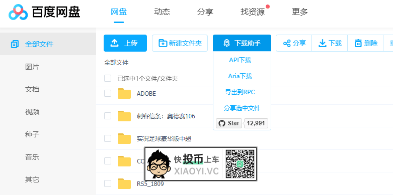 在百度网盘文件下载页会出现一个 “下载助手” 选择 API下载 或 Aria下载,然后通过多线程的下载工具来下载,如「IDM」或「XDOWN」。