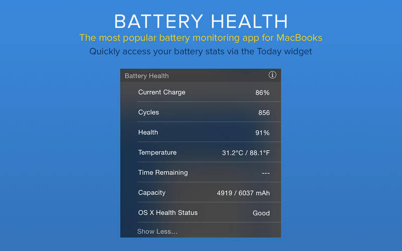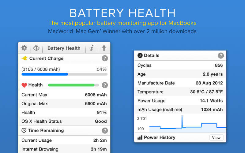 Battery Health是一款查看MacBook电池使用详情和健康度的软件,通过该软件可以查看到当前电量、健康度、最大容量、设计容量、健康状态、使用时间、循环次数、电池出厂时间、电池已用年限、温度与功耗等等。