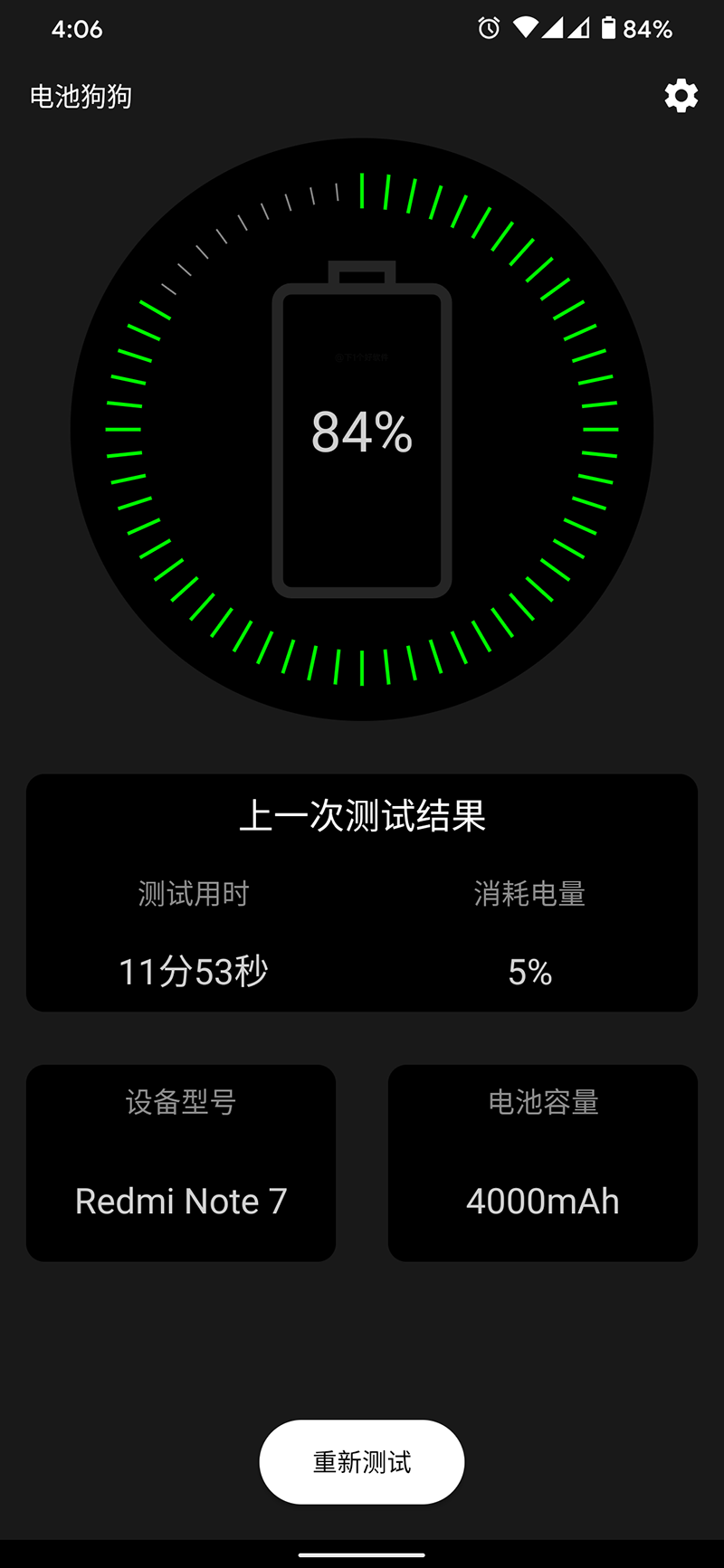 功能上可以快速的了解测试结果,包括:手机电量百分比、上一次测试结果(测试用时、消耗电量)、设备型号、电池容量、重新测试。