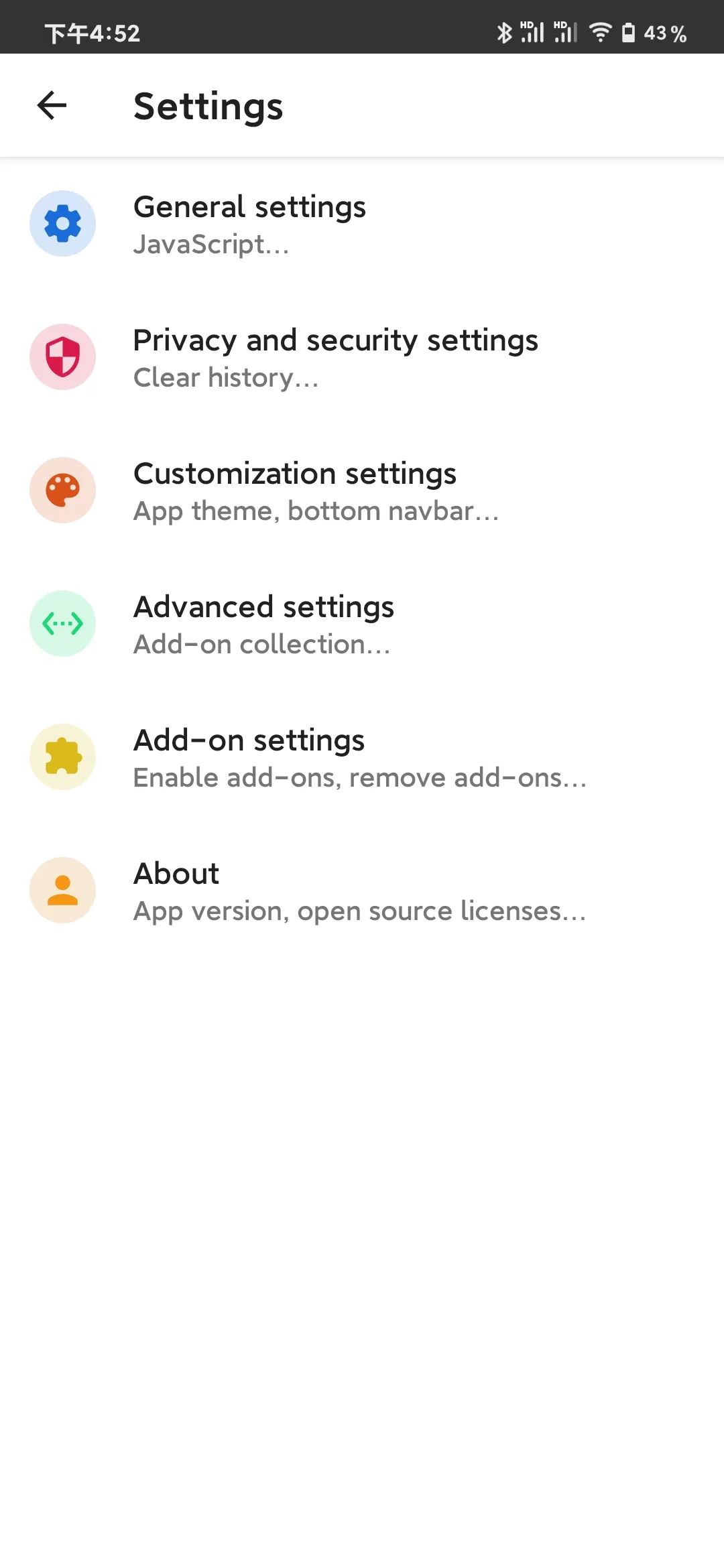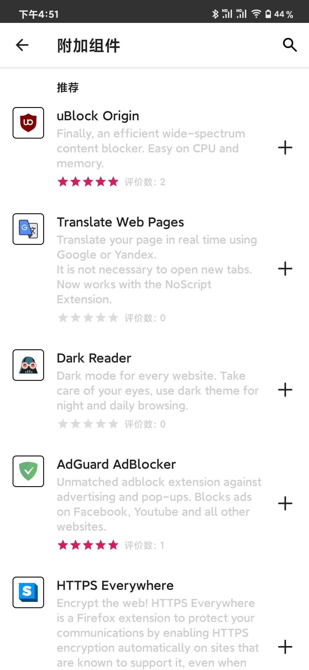 扩展插件方面目前支持Violentmonkey、uBlock Origin、AdGuard Blocker、Translate Web Pages、NoScript Security Suite、I don’t care about cookies等等,可以在设置的附加组件里面安装。