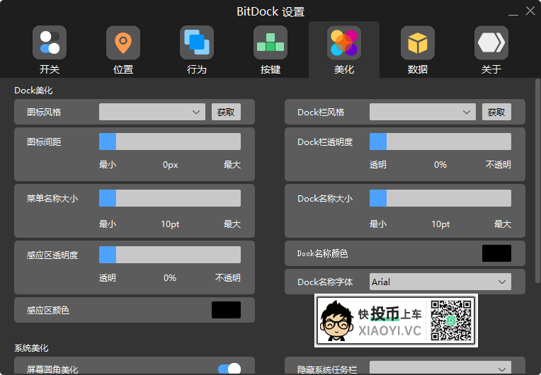 DOCK栏美化方面支持更改图标、图标间距、DOCK风格、透明度、字体、颜色,以及可以对 Windows 10 的任务栏设置磨砂效果和透明效果。