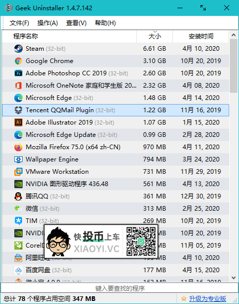 有些用户装了很多软件在C盘,有些基本没用到,可以卸载掉。系统本身自带的卸载管理功能,是调用程序本身的卸载程序,某些流氓软件会埋个雷在你电脑里,不会彻底清理,所以这里SoftGoing推荐用这款「Geek Uninstaller」免费小巧的卸载工具。