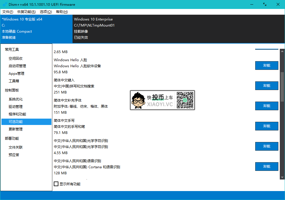 需要更高级点的删除卸载,这里推荐用「Dism++」支持对系统组件、语言包、应用商店等删除。