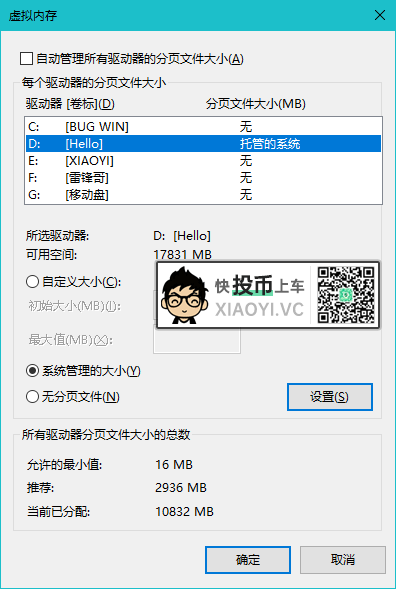 虚拟内存功能就是当你内存不够用时,利用磁盘容量来生成交换文件,保证内存不足时,系统和软件都能正常运作。虚拟内存文件默认会在C盘,自动托管。我们可以手动设置到其它盘符,也可以手动设置虚拟内存大小。