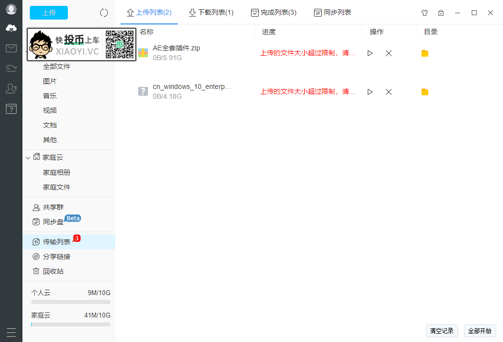 免费用户上传文件大小貌似限制在4G大小,顺便吐槽下不支持拖拽文件到客户端上传,必须点击上传按钮,再选择文件,好糟糕的体验。