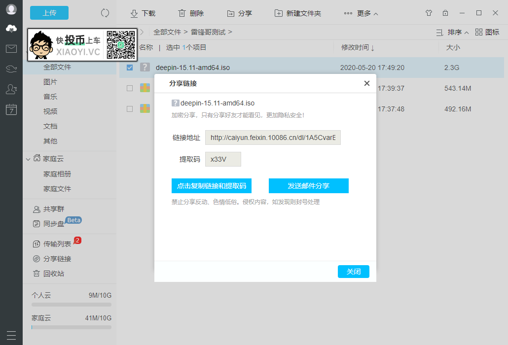 文件分享没有时限选择,默认就是永久有效的?分享的地址,需要提取码。(当然分享非法内容,也是会被河蟹的。)