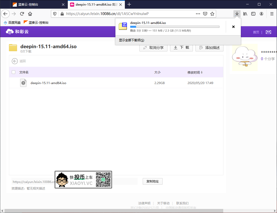 分享的文件下载地址,需要你登录「和彩云」网盘后才能下载,在网页用浏览器自带的下载,速度居然还挺快的,稳定在 10MB/s 左右,比客户端还快。