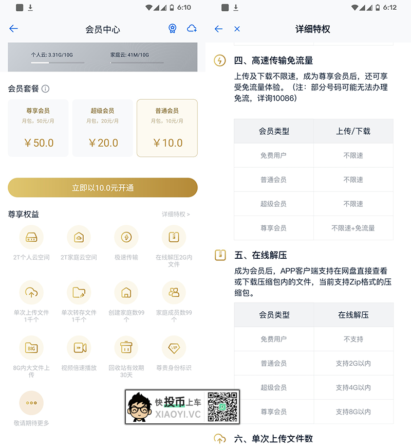 会员方面有三个级别,可获更大容量空间、更大单文件上传、支持在线解压、更大的转存文件数、视频倍数播放等等。