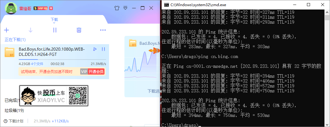 然后「迅雷」开启下载,Ping微软Bing网站,延迟平均在 302ms 左右。关闭「cFosSpeed」后的延迟在 530ms 左右。
