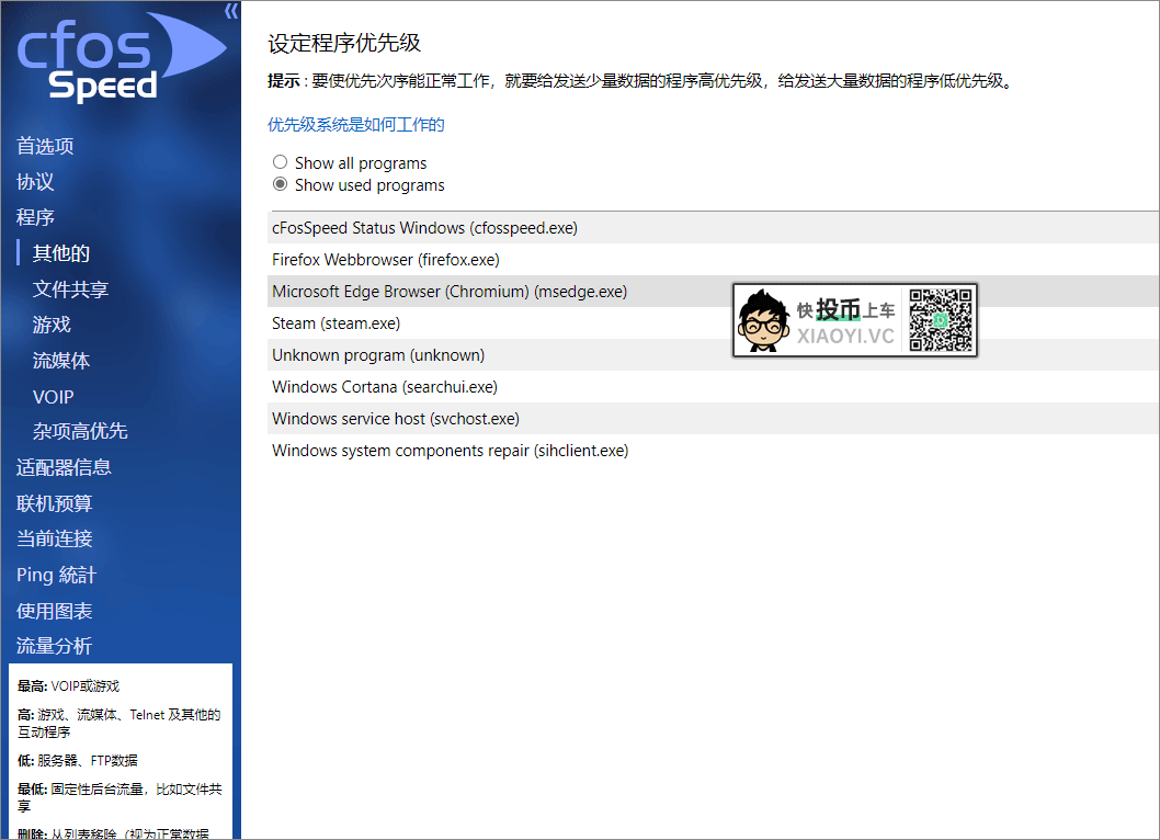 又或者不想下载文件的时候,影响到网页正常浏览,可以把浏览器的优先级选择最高。在程序优先级里面,点击 "Show used programs" 选择你的浏览器。