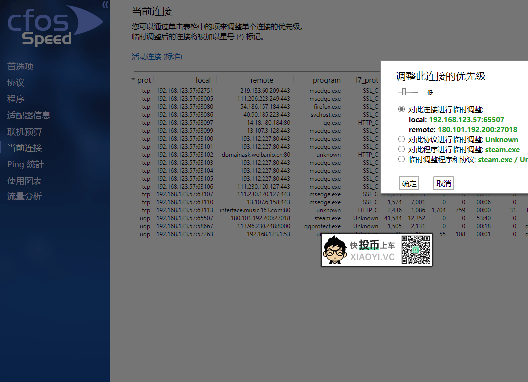 也可以查看当前进程的连接情况,可以对占用网速比较多的程序,直接设置优先级,例如后台挂着「STEAM」下载游戏,影响到网页打开速度,直接选择「STEAM」进程,设置较低的优先级。