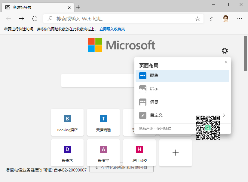 「Chromium Edge」正式版的界面和测试版没什么大变化,还是那么清爽简洁,启动页布局可以设置为聚焦、启示、信息和自定义。