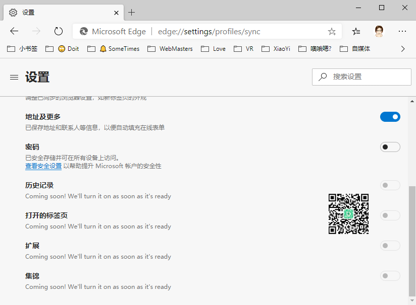 「Chromium Edge」数据同步上已经支持书签、地址、密码。历史记录、打开的标签页、扩展、集锦暂不支持。