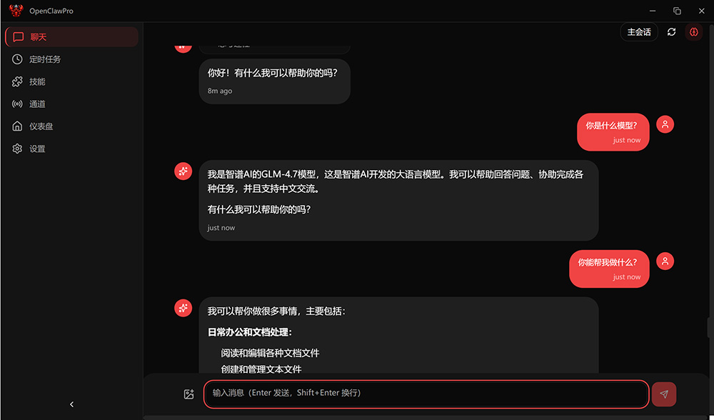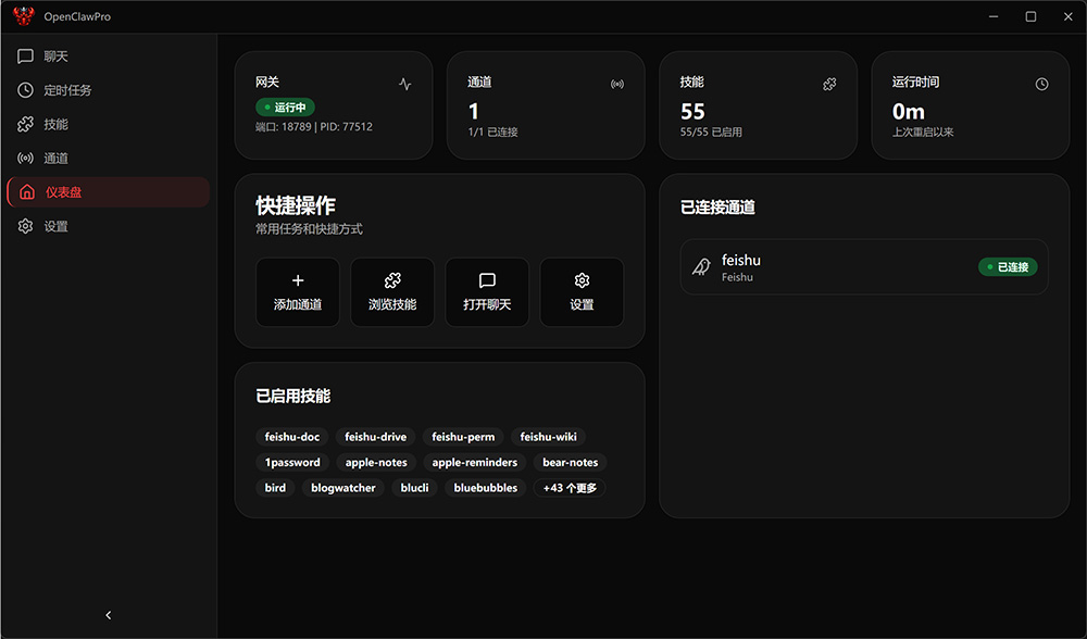 - 多通道接入:一键接入飞书、TG、Discord 等消息平台,还有 ClawPro 手机 App 随时随地与 AI 对话。