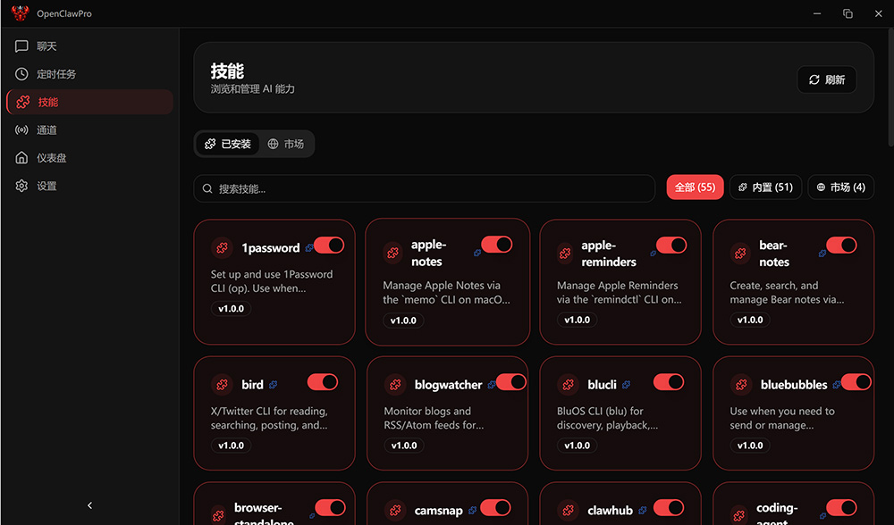 - 55+ 技能:内置浏览器控制、网页搜索、文件管理、GitHub 集成等 55+ 技能,通过 ClawHub 一键安装更多。