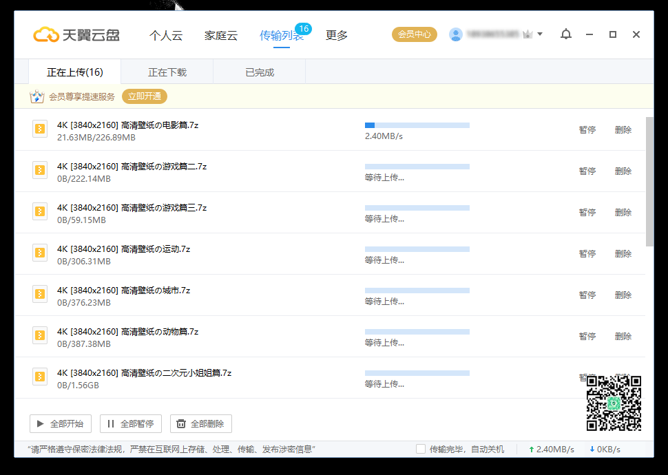 购买会员的用户可以获得宽带智能提速,据网友评测可以达到500M的下载、50M以上的上传,还有空间无限扩容、视频高速播放通道、在线图片编辑、解压文件、单文件上传无限制等。
