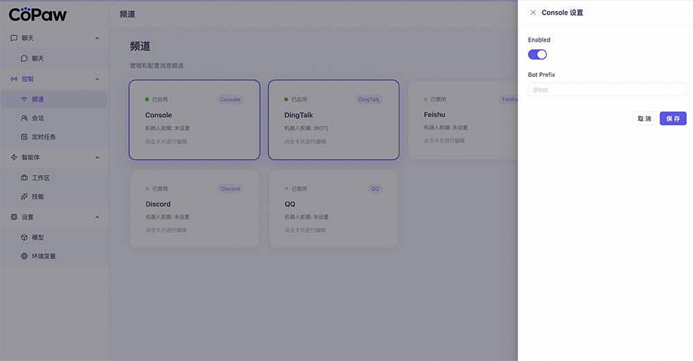 - 定时执行「自检/摘要」:用你写好的一串问题问 CoPaw ,把回答发到你上次对话的频道。