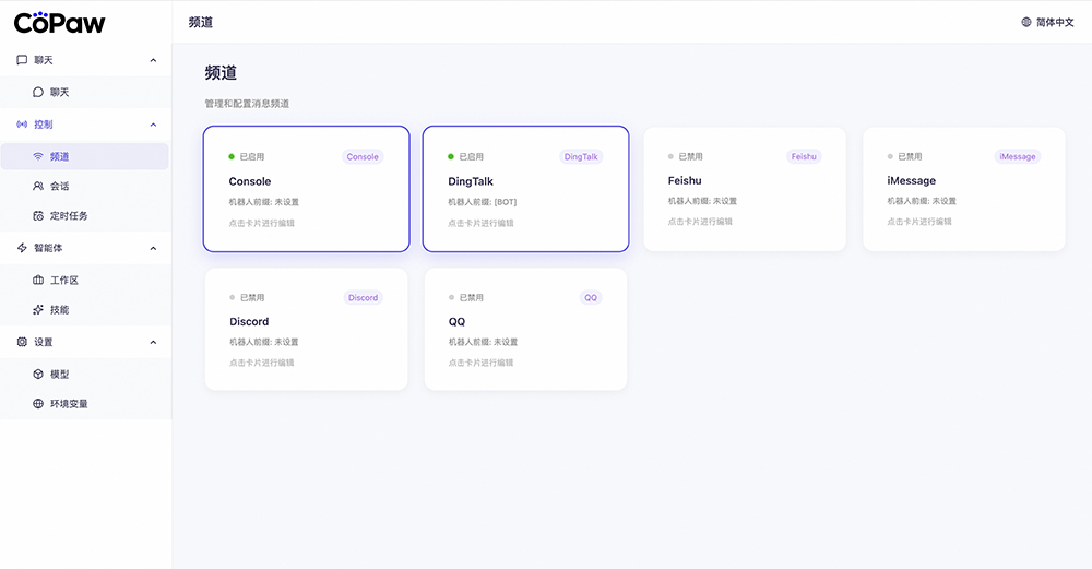 - 在聊天软件里对话 在钉钉、飞书、QQ、Discord 或 iMessage(仅 Mac)里发消息, CoPaw 在同一 app 内回复, 查资料、记待办、回答问题等都由当前启用的 Skills 完成。一个 CoPaw 可同时接入多个 app ,你在哪个频道聊,它就在哪个频道回。