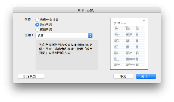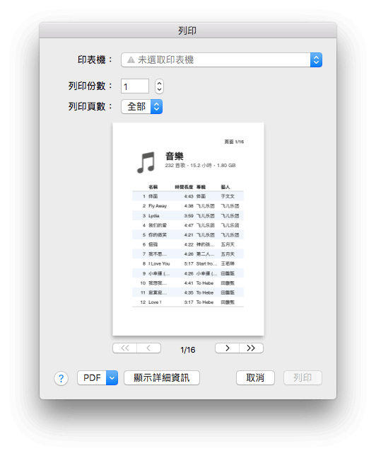 如何统计macOS中「iTunes」媒体库音乐文件数量 2020年1月1日 技巧 116.78k人感兴趣 SoftGoing先森 苹果在macOS新版中的iTunes取消了歌曲数量统计功能,对于想了解目前iTunes媒体库具体歌曲数量的用户来说将会比较麻烦。如果你的媒体库歌曲是按歌手→专辑的方式整理,想统计目前媒体库歌曲数量,你可以试试下面的方法。打开iTunes打印功能,在弹出的打印窗口界面选择设置页面,将缩放值调大便于后面能看清楚歌曲数目,完成缩放设置后点击打印进入预览界面,此时你可以通过预览查看iTunes媒体库音乐数据量。 © 本文著作权归作者 [SoftGoing] 未经许可,不得转载使用。 < 上一篇 下一篇 >