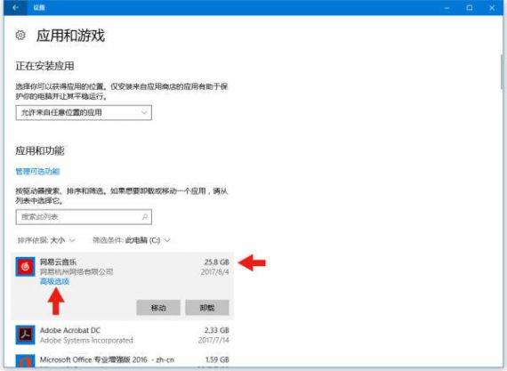 【4】“幕后黑手”终于现身了,把应用按照大小顺序排序之后,发现“网易云音乐”竟然25G之多,吓得我赶紧听了两首歌压压惊。点选“高级选项”。