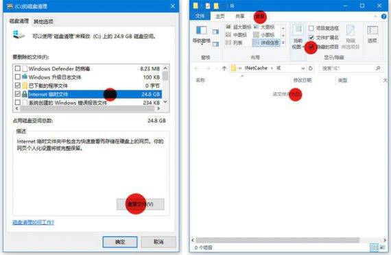 系统盘C盘的容量越来越小,就用系统自带的“磁盘清理”工具,清理一下垃圾,发现“Internet临时文件”无法清除,然后点选“查看文件”。“诡异”的事情发生了,文件夹是空的,还不甘心又勾选了“查看隐藏文件夹”,还是空空如也。