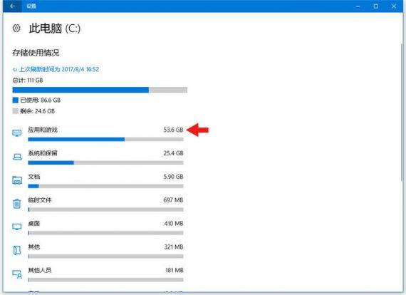 【3】发现“应用和游戏”这一项占用磁盘容量最大,十分异常,点选进去,继续查看。