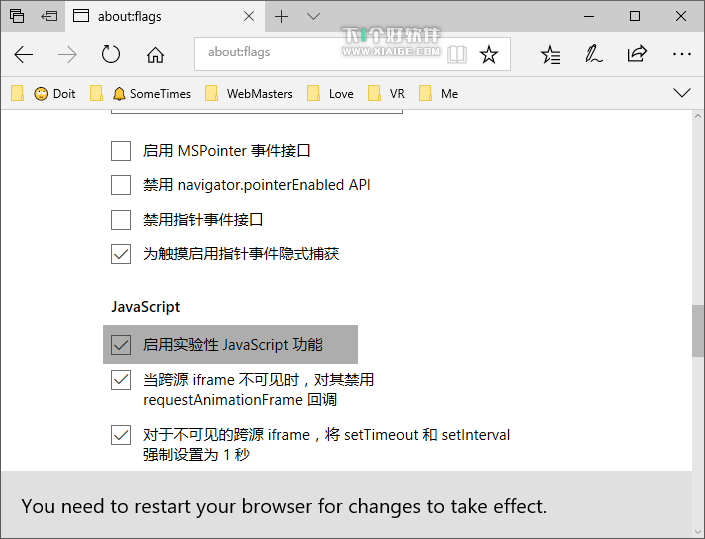 打开Edge浏览器后,在地址栏输入 about:flags 后回车,找到 ”实验性JavaScript功能“ 勾选,然后重新启动Edge浏览器。