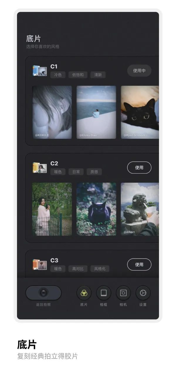 具有机械质感的相机界面,配合丝滑的出片动画,带来原汁原味的拍照和成像乐趣。