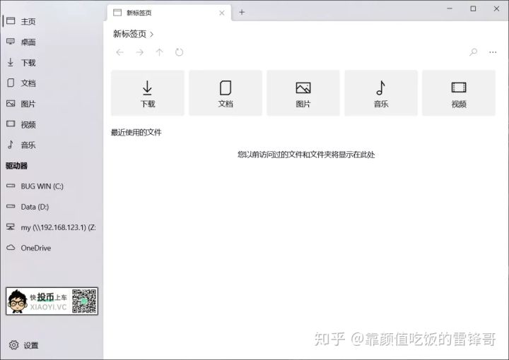 从界面上看「Files UWP」对比系统的资源管理器显得更加现代化,非常简洁,主标签页界面默认提供了常用的文件夹,以及支持显示最近使用的文件,侧栏方面也整合了「OneDrive」网盘。