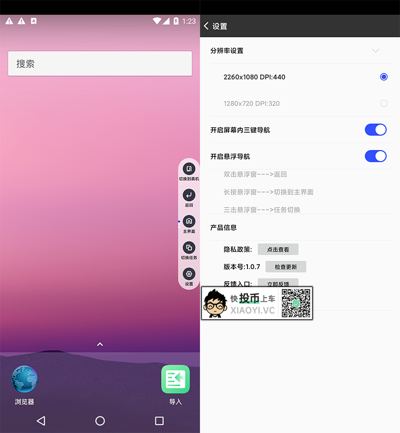 自带悬浮按钮可以返回到真机,以及三大金刚键操作、设置上支持设置分辨率(如果你手机配置比较低,可以适当调低分辨率)、悬浮导航设置。