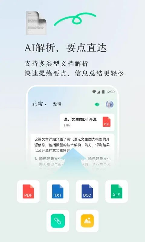 元宝支持多类型的文件、图片识别及阅读,用户可直接上传文件,快速输出要点,信息总结更轻松。