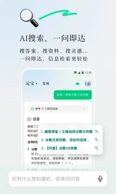 您可以随时与元宝发起对话,元宝会通过强大的模型和搜索能力给您精准的答案,搜答案,搜资料,搜灵感,一问即达,信息搜索更轻松。