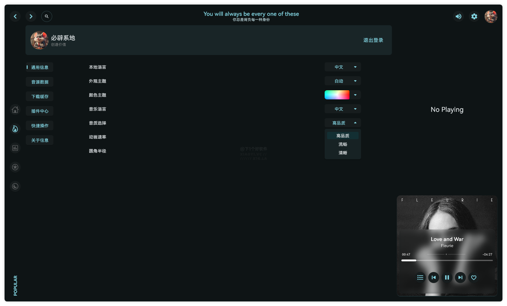 支持外观主题设置、颜色主题、音质选择(高品质、流畅、清晰)、音乐语言、动画速率、圆角半径。