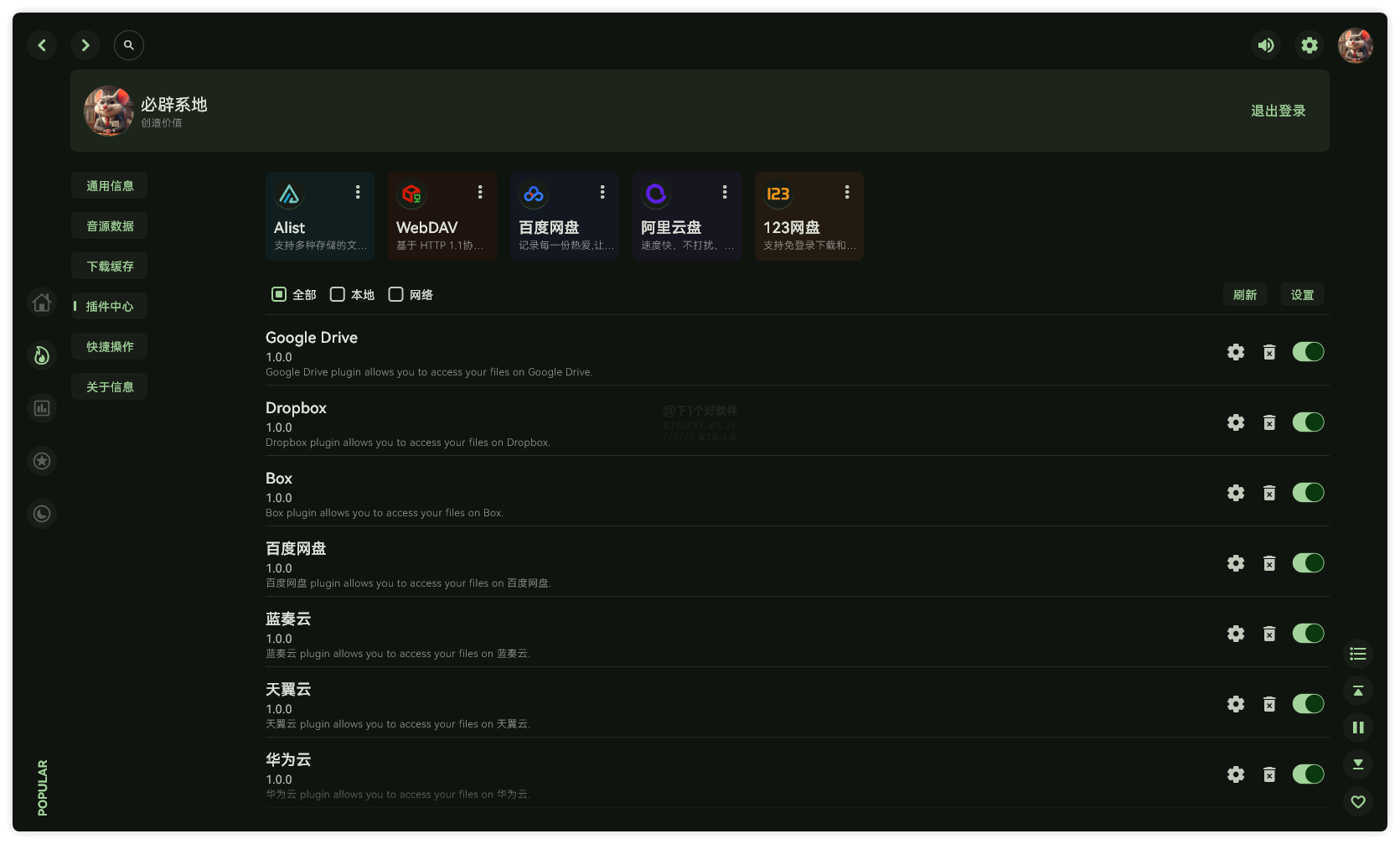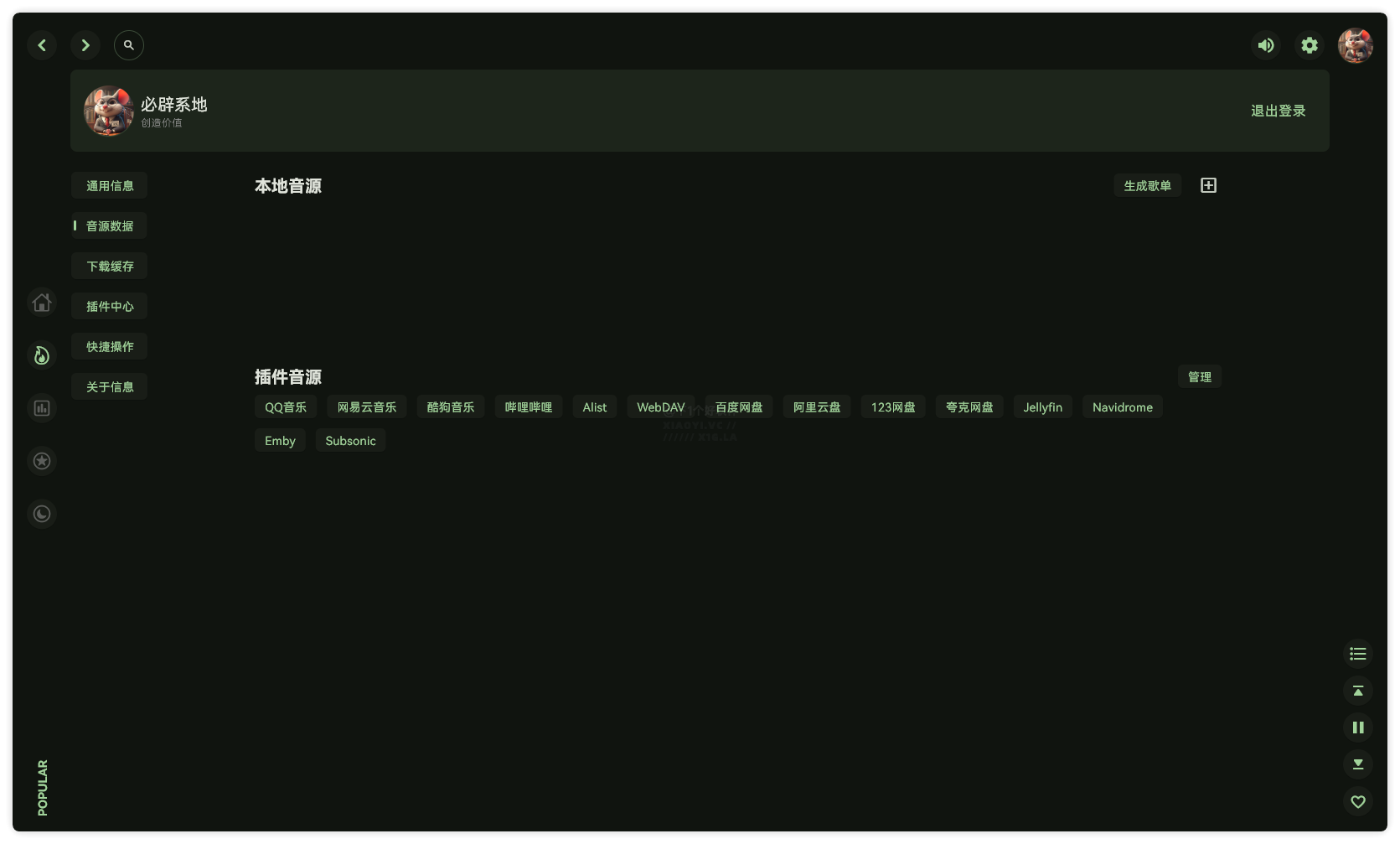支持本地音源、可以生成歌单。插件音源方面来源音乐平台和网盘,提供了扣扣音乐、网易云、酷狗、哔哩哔哩、Alist、百度网盘、阿里云盘、123网盘、夸克网盘、Emby、Subsonic、Jellfin、Navidrome,你也可以管理不需要的音源。