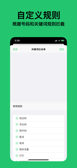 - 可以自定义号码和关键词规则拦截垃圾短信