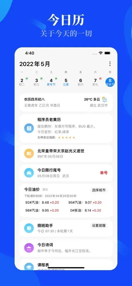 「今日历」是一款专业精美的日历 App,提供老黄历、万年历、历史上的今天、今日限行、今日油价、今日热榜、今日早报、今日晚报……以上目之所及,只是开始,超过50+模块自由订阅。