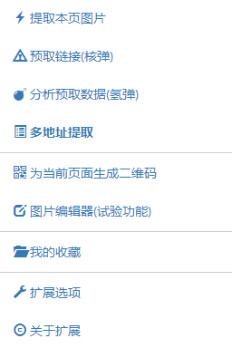 扩展包括三种提取模式,基本模式"提取本页图片"(默认快捷键:Alt + Shift + Y),加强模式"&预取链接"、"&分析预取数据",后续提取模式是其前述提取模式的延伸。