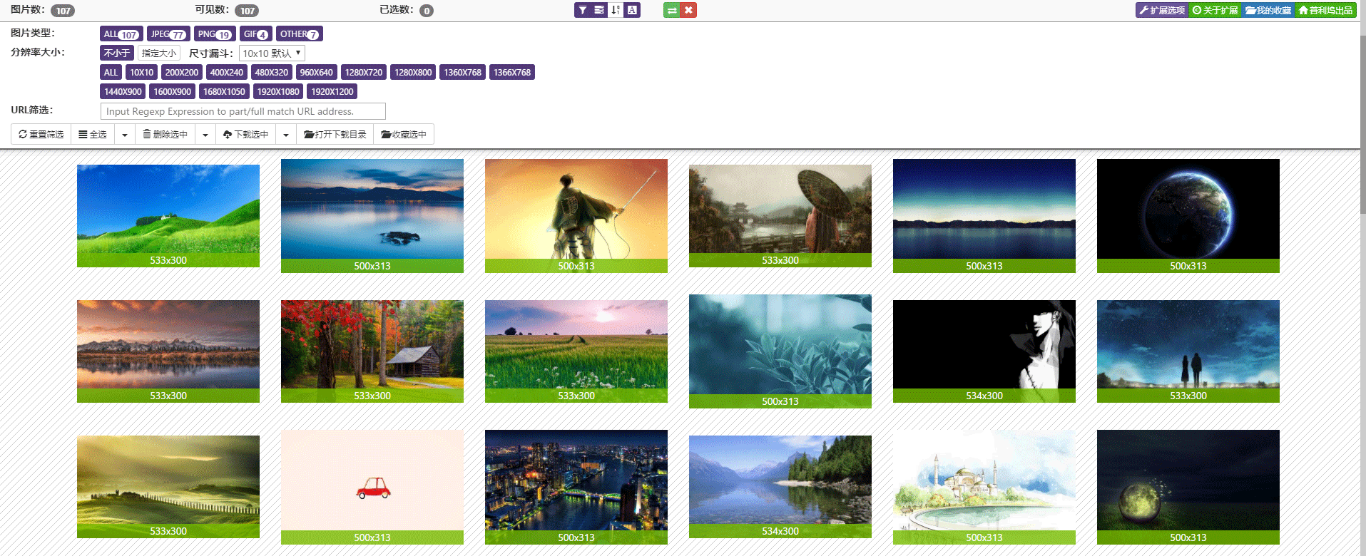 扩展提取的图片由筛选页面呈现给用户进行后续操作。在筛选页面中,图片已按图片大小由大到小进行排序显示,你可以通过菜单中的图片扩展类型进行图片类型筛选显示,通过分辨率大小进行图片的大小筛选显示。图片大小筛选提供了两种模式,不小于及指定大小,你可以在"扩展选项"中对该两种模式的分辨率选项进行编辑。
