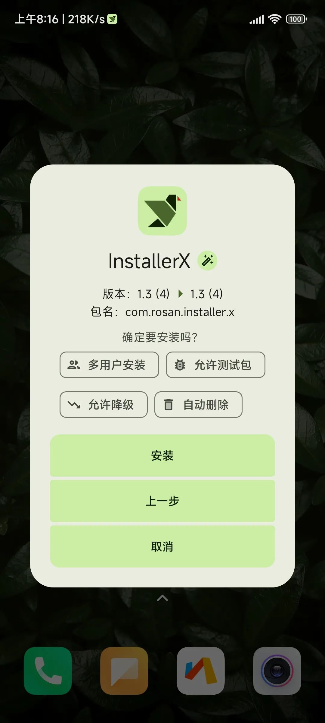 现在可以用「installerX」这款安全器代替品,相对于原生系统,这个安全器也带来了更多的安装选项:对话框安装、通知栏安装、自动安装、声明安装者、选择是否安装到所有用户空间、允许测试包、允许降级安装、安装后自动删除安装包。