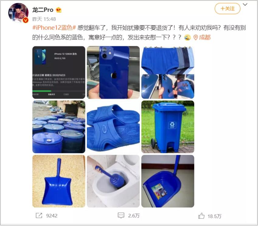 在 20 号各大自媒体UP主都拿到了 iPhone 12 的蓝色版本,只不过蓝色和前渲染图中富有高级质感的蓝色不同,被网友黑惨了,瞬间受到无数吐槽,甚至一度冲上热搜。